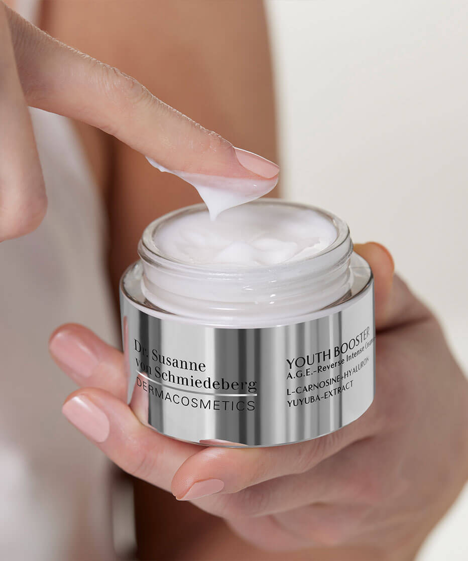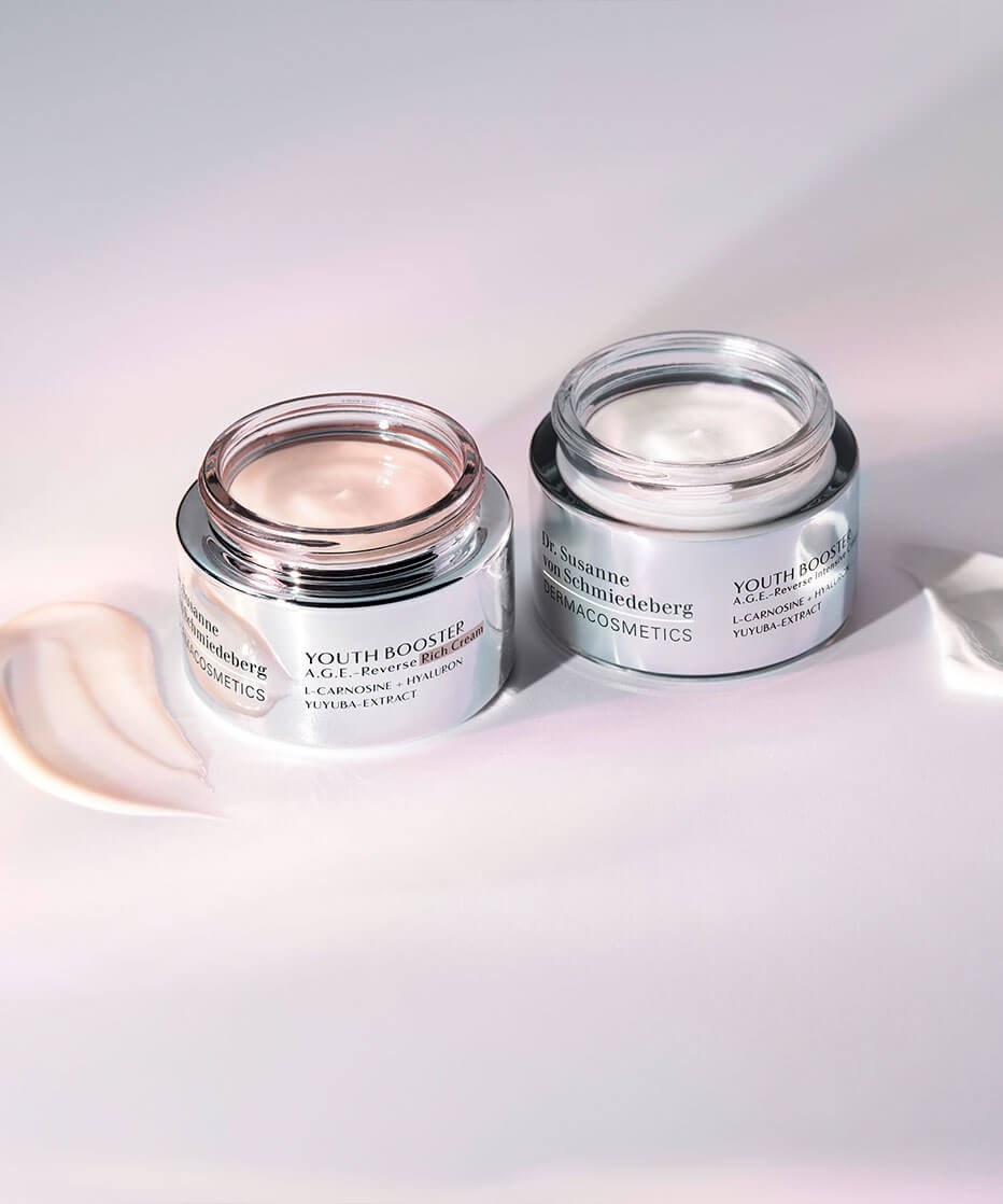 Die Youth Booster A.G.E.-Reverse Intensive Cream Mask wirkt zweifach und effektiv gegen Hautalterung, indem sie die Zellverzuckerung verlangsamt und bereits versteiften Kollagenfasern wieder mehr Spannkraft zurückgibt. Der einzigartige Wirkstoff L-Carnosine kann A.G.E.s (Advanced Glycation Endproducts), die in der Haut für deren Verzuckerung verantwortlich sind, reduzieren und somit den Prozess der Hautalterung verlangsamen. Gleichzeitig kann der innovative YuyubaExtrakt bereits verzuckerten Kollagenfasern ihre Elastizität zurückgeben, indem es den Abbau bestehender A.G.E.s unterstützt. Für den Glätte-Effekt vermindert ein Honigdorn-Extrakt sofort optisch Fältchen und Linien. Betain aus der wilden Malve steigert intensiv die Hautfeuchtigkeit. Das sichtbare Ergebnis: jugendlich, straffere, glattere Haut. Für alle Hauttypen geeignet.